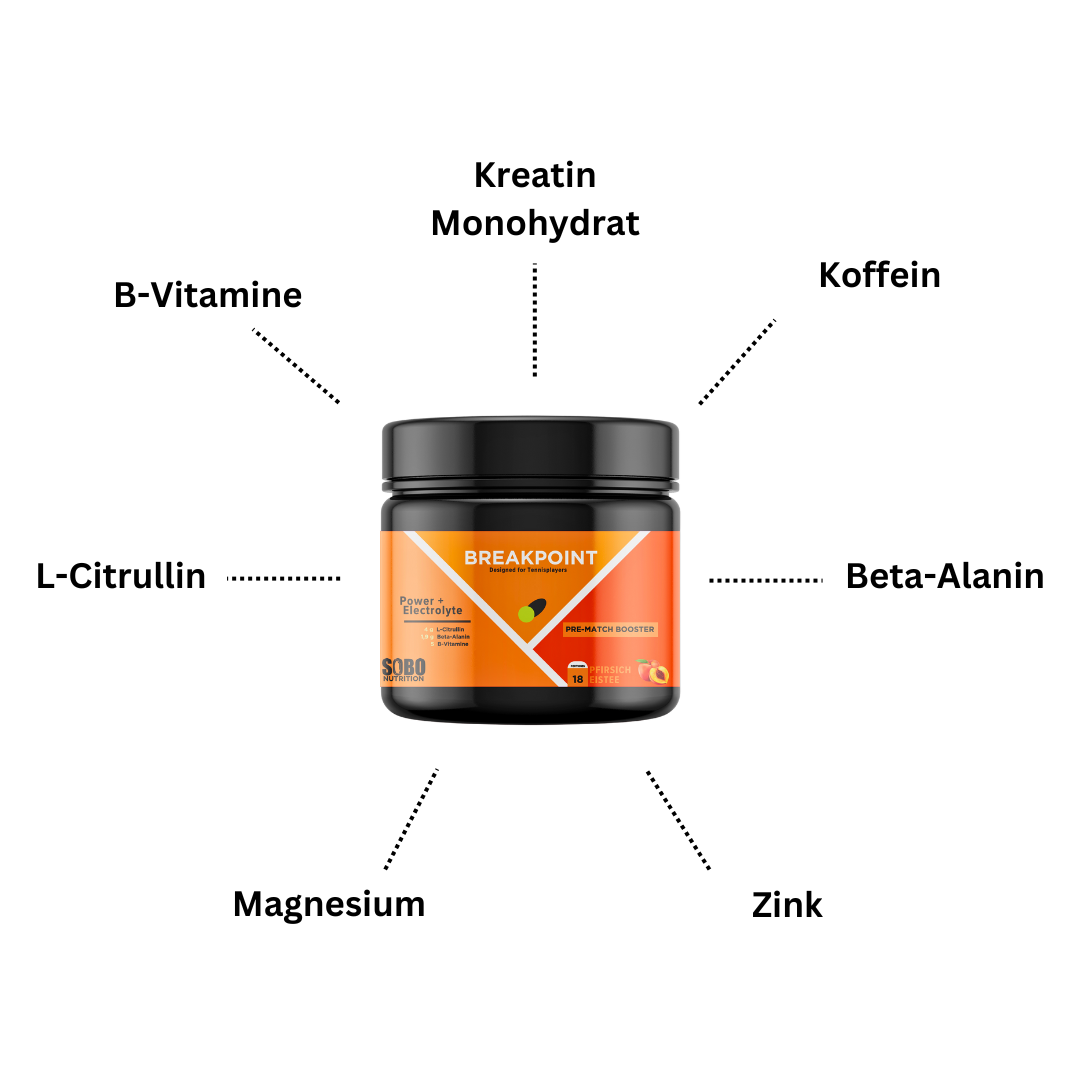 Der Tennis-Booster enthält Inhaltsstoffe wie Koffein, Kreatin, L-Citrullin und Beta-Alanin. Diese können die Ausdauer unterstützen, die normale Durchblutung fördern und die Ermüdung während des Trainings verzögern. Koffein trägt zur Steigerung der Aufmerksamkeit bei, während Kreatin die körperliche Leistungsfähigkeit bei intensiver Muskelanstrengung erhöhen kann.